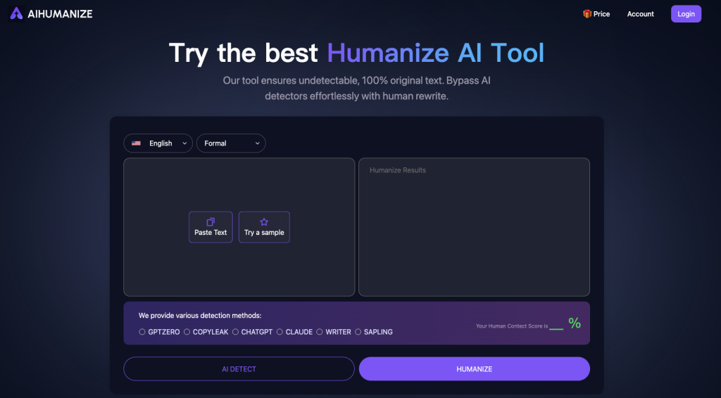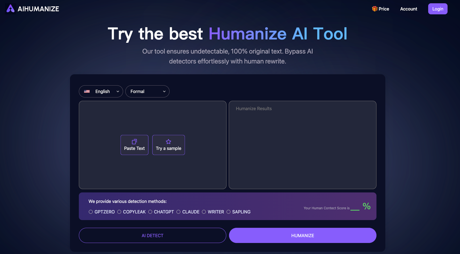 AI Humanize is a tool that turns AI text into human-like writing, helping users avoid AI detection. It works in three steps: paste AI-generated text, check AI content with ‘AI Detect’, and ‘Humanize’ to create undetectable content.