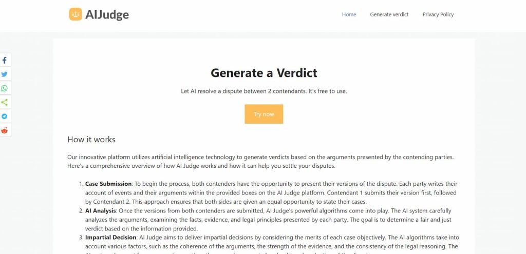 AI Judge is a revolutionary ai tool that is taking the legal world by storm. It is an automated system that can analyze legal documents and cases, providing an objective and unbiased opinion on the matter. This tool is invaluable for lawyers and judges, as it can help them quickly and accurately make decisions on cases. It can also help to ensure that all parties involved are treated fairly, as the AI Judge is programmed to be impartial and follow the law. In addition, AI Judge can provide helpful insights and recommendations to attorneys and judges on the best course of action. This tool has been proven to be highly effective in helping to resolve disputes quickly and efficiently. With AI Judge, the legal system can become more efficient and effective, leading to a more just society.