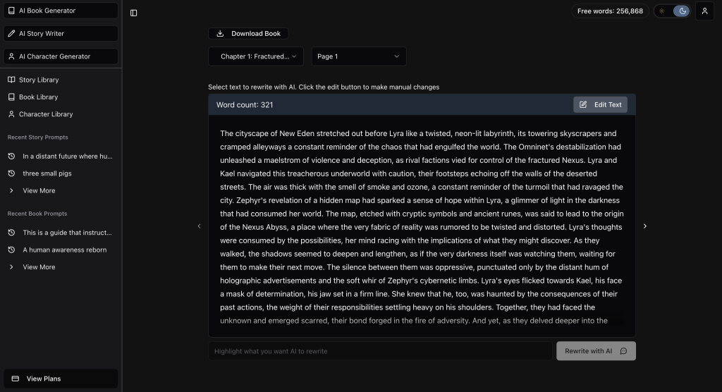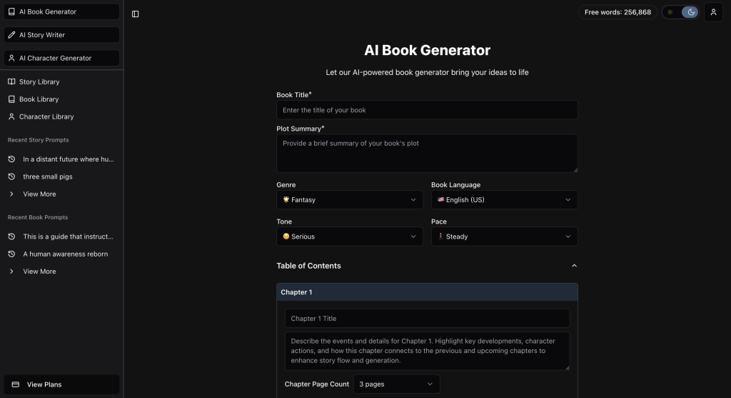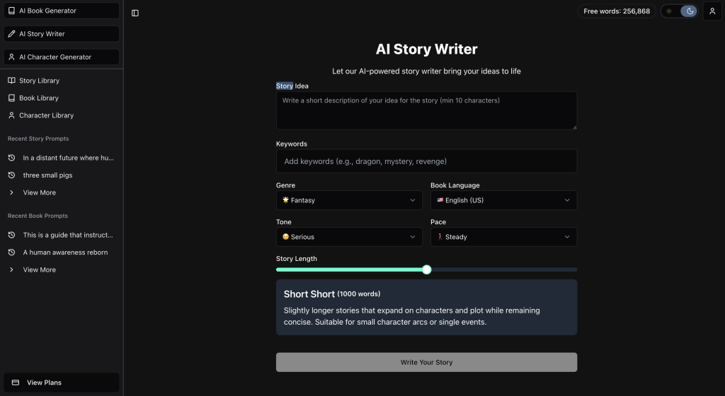 The AI Story Writer transforms storytelling into an intuitive, AI-assisted process. Whether you’re writing short fiction, long-form narratives, or character-driven stories, this tool generates coherent and engaging content based on user-defined settings.