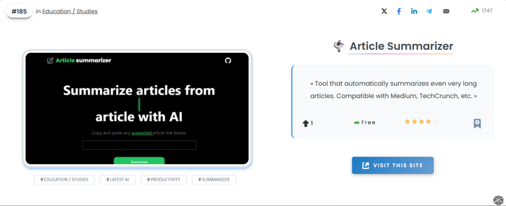 Tool that automatically summarizes even very long articles. Compatible with Medium, TechCrunch, etc.