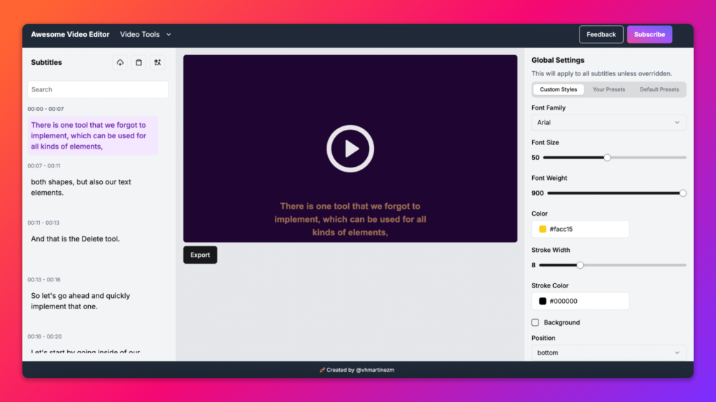 Awesome Video Editor makes it effortless to add accurate subtitles to your videos. Our AI-powered tool automatically transcribes speech into text, enhancing accessibility, engagement, and global reach. Customize, edit, and export subtitles in just a few clicks!