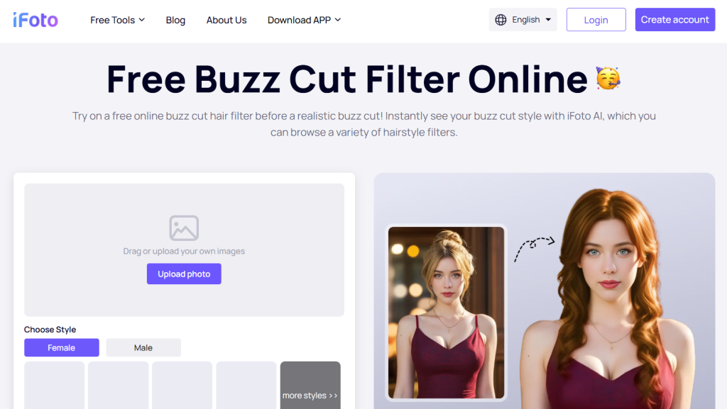 The iFoto Buzz Cut Filter is an AI-powered tool that allows users to visualize how they would look with a buzz cut hairstyle.The filter employs advanced technology to overlay the buzz cut effect in real-time, enabling customization of the hairstyle.