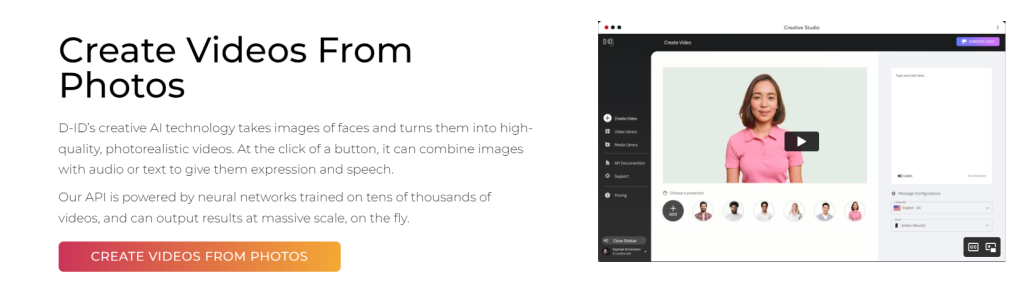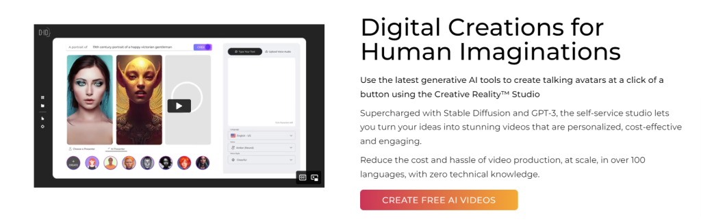 Creative Reality Studio (D-ID) is a revolutionary platform that helps you create videos with talking avatars. It enables businesses and creators to produce customized videos featuring their own avatars with just one touch. You can customize the avatar’s look, voice and expressions, as well as the backgrounds, transitions and other elements of the video. With Creative Reality Studio (D-ID), you can take your business or brand to the next level with engaging videos that capture attention and help you stand out from the competition.