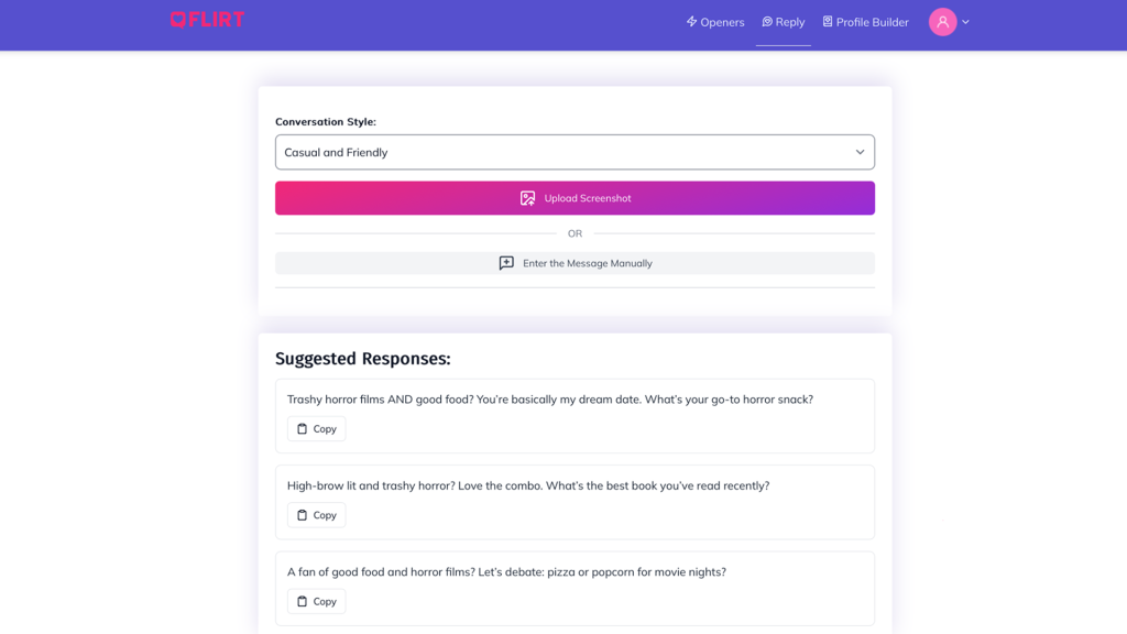 Flirt is your go-to tool for starting conversations with confidence. It crafts clever, attention-grabbing openers that help you break the ice and spark interest right away. When chats begin to lose momentum, it provides fresh, engaging responses to keep the conversation flowing naturally.