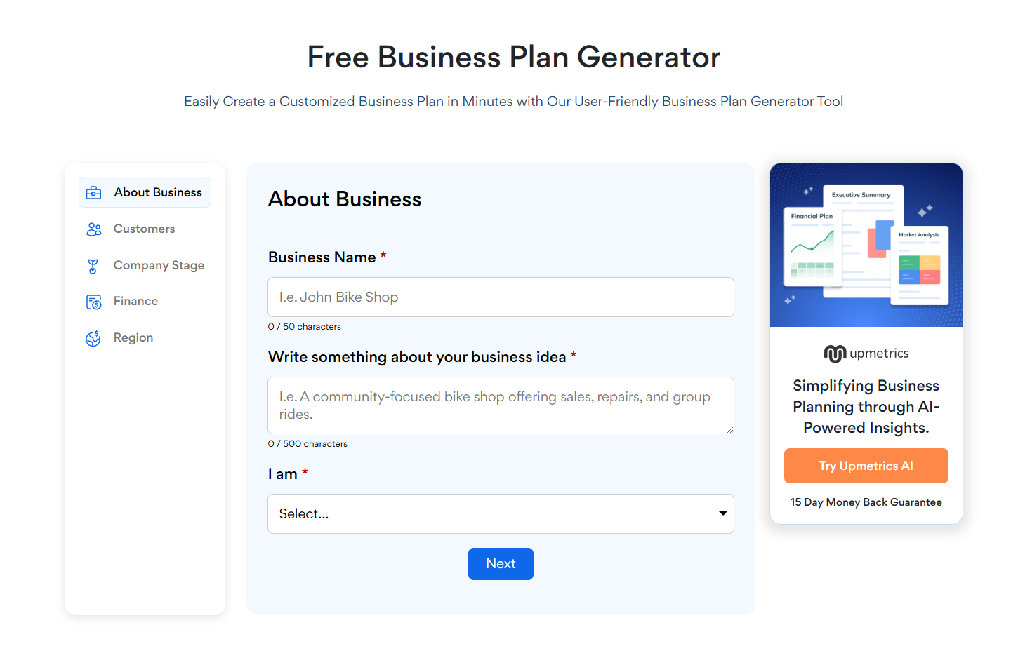 Upmetrics’ free business plan generator is specifically designed to help new entrepreneurs and small business owners create solid plans with ease. Just enter key details about your business, and get a polished plan ready in minutes.