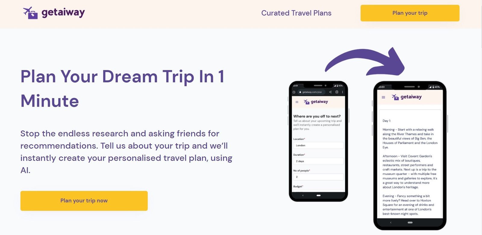 Getaway is an AI tool that helps you plan the perfect vacation. It takes the hassle out of researching and booking a trip by providing you with tailored recommendations based on your preferences. With Getaway, you can quickly find the best flights, hotels, and activities for your destination. The AI tool also provides you with detailed information about the destination, including weather, attractions, and local customs. You can even customize your itinerary to make sure you get the most out of your trip. Getaway makes planning a getaway easier than ever. With its intuitive interface and comprehensive recommendations, you can save time and money while creating an unforgettable experience. So, if you’re looking for a stress-free way to plan your next getaway, Getaway is the perfect AI tool for you.