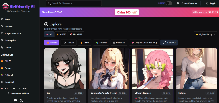 Girlfriendly AI is a platform designed to stimulate engaging conversations with multiple AI personalities. The platform is uncensored and allows users to create NSFW images of unique styles and spicy conversations.