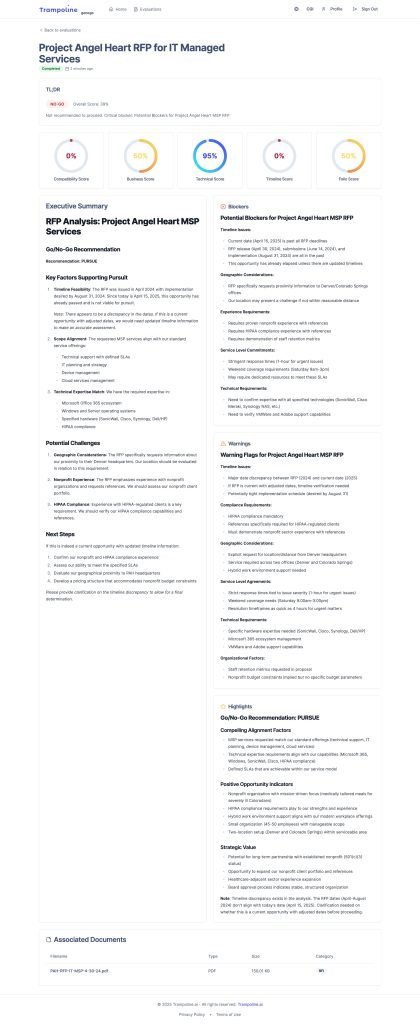 Make faster, data-backed bid/no-bid decisions and focus your team’s time where it counts. Upload your RFPs, and Go/NoGo instantly evaluates fit based on past proposals, company capabilities, your own business rules and deal history — no setup or integrations required.