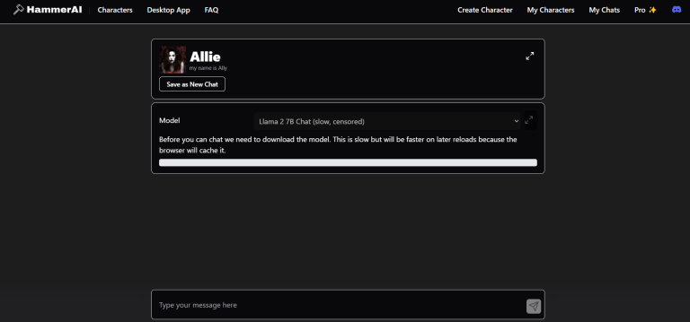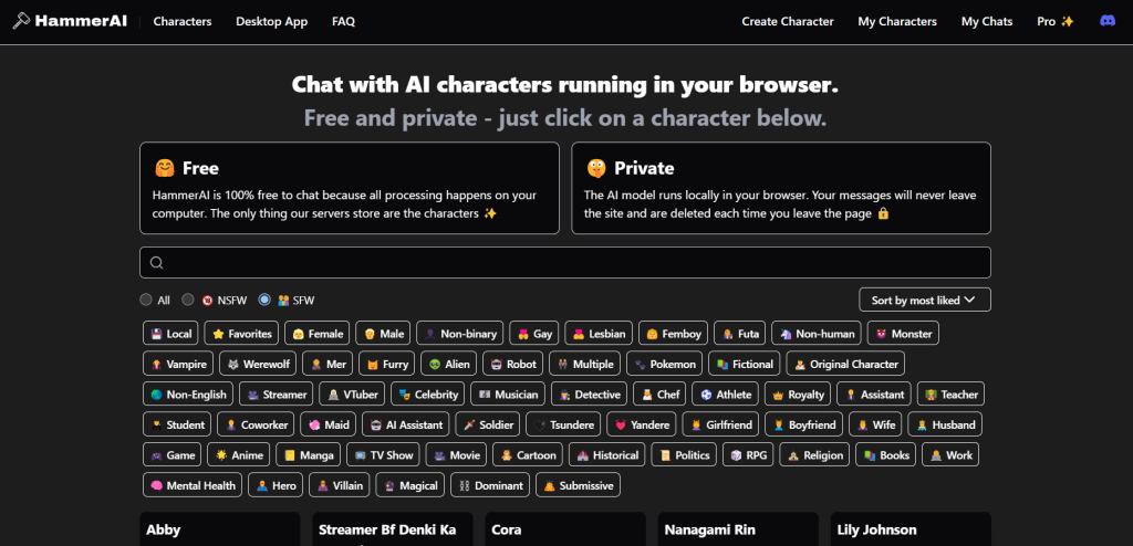 HammerAI is a PRIVATE and FREE character AI chat platform for creating and interacting with NSFW AI chat in role-play scenarios. The AI model runs locally in the browser, ensuring user privacy and security.