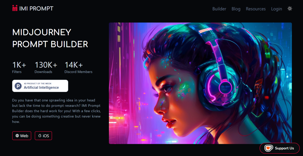 A prompt builder for the Midjourney AI. Easy to use and with many options.