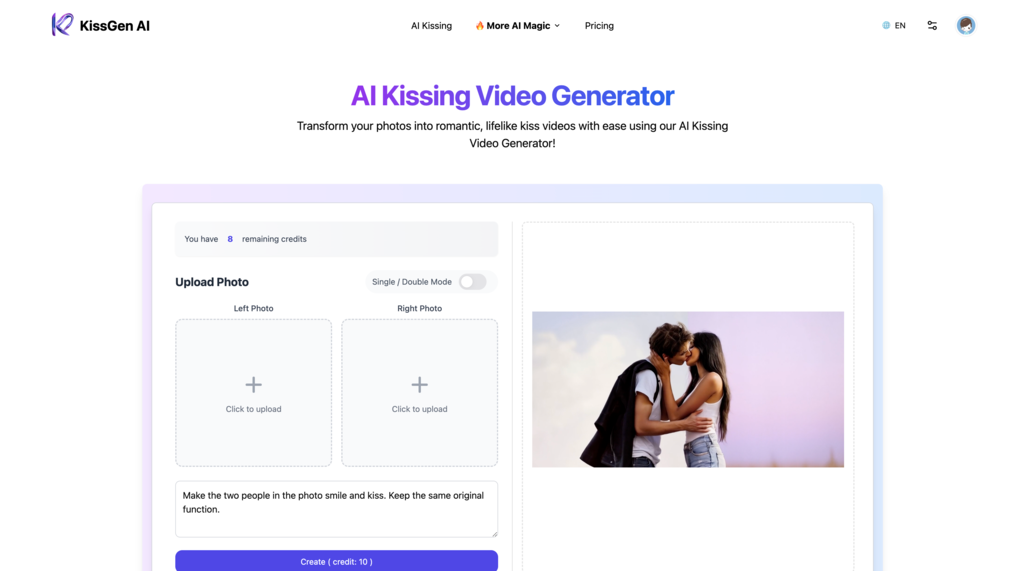 A revolutionary tool that transforms your photos into realistic kissing videos. Whether it’s a celebrity crush, a distant lover, or a fictional character, KissGen AI makes your wildest romantic fantasies come true with just a single or Double photo upload.