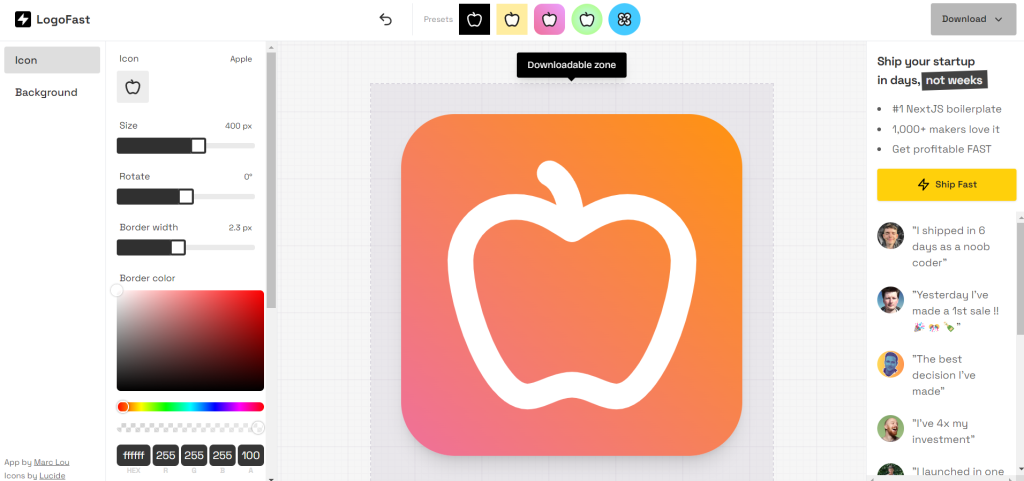 An AI assistant that helps you create a logo easily. It works from a starting icon, with the option of making a few visual adjustments!