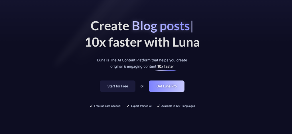 Luna is the ultimate AI content creation platform that helps you generate original and engaging content 10x faster. With Luna, you can create blog posts, articles, product descriptions, social media posts, and more in just minutes.