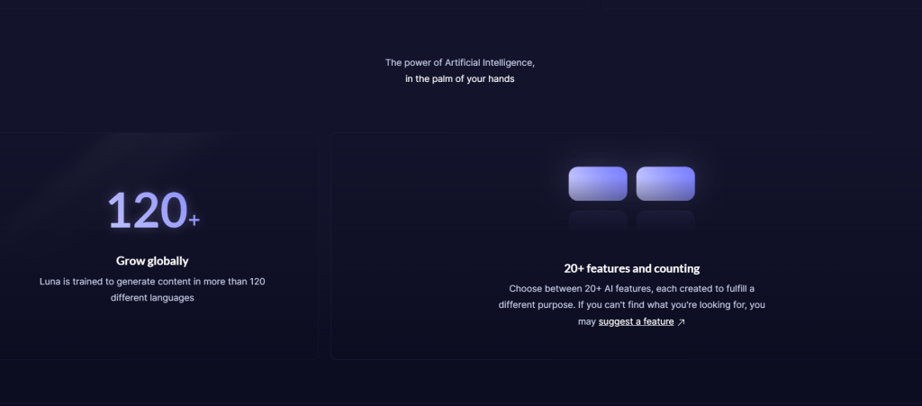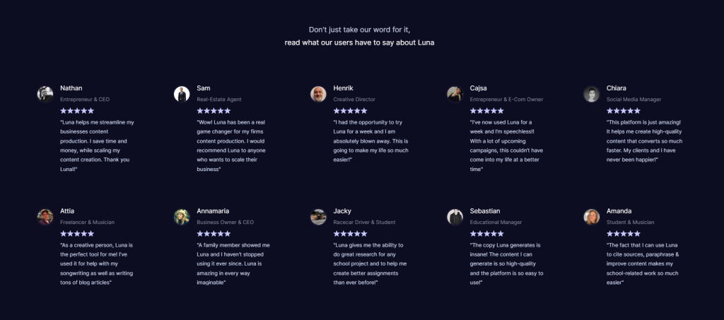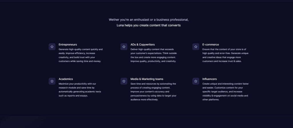 Using natural language processing (NLP) and advanced machine learning algorithms, Luna can quickly generate high-quality content that’s tailored to meet the needs of your audience. Plus, its intuitive user interface makes it easy for anyone to use.