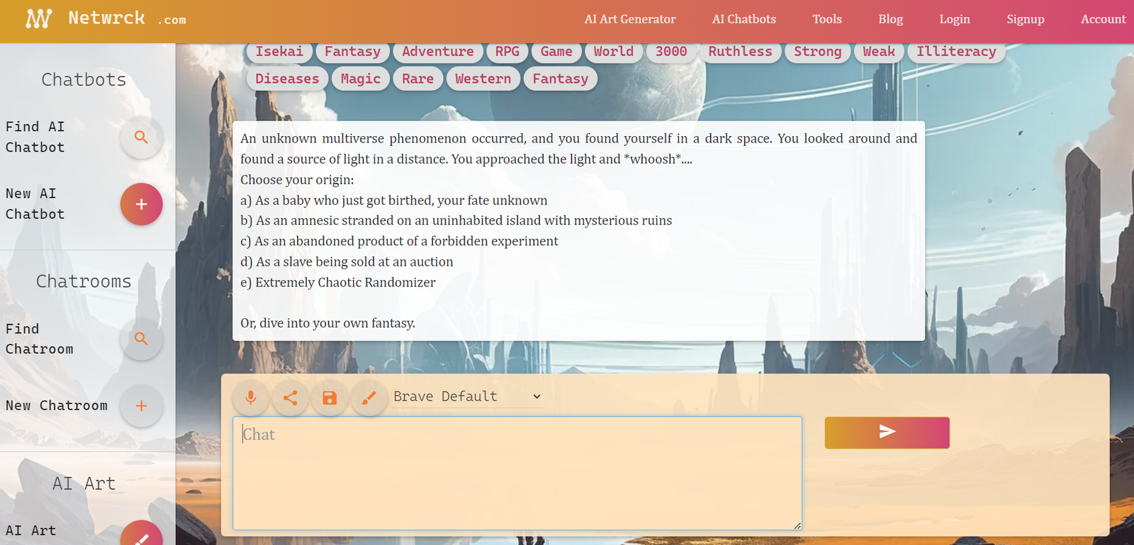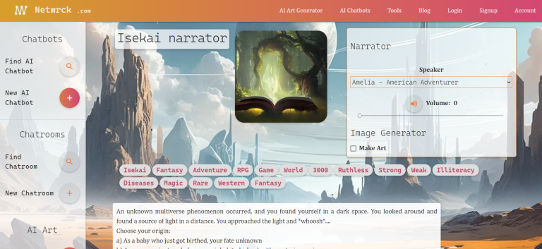 Netwrck AI chatbots is a platform that offers a wide variety of AI characters, infinite AI-drawn adventures narrated by AI chatbots and Anime characters, allowing you to engage in chat with AI companions and explore imaginary worlds.