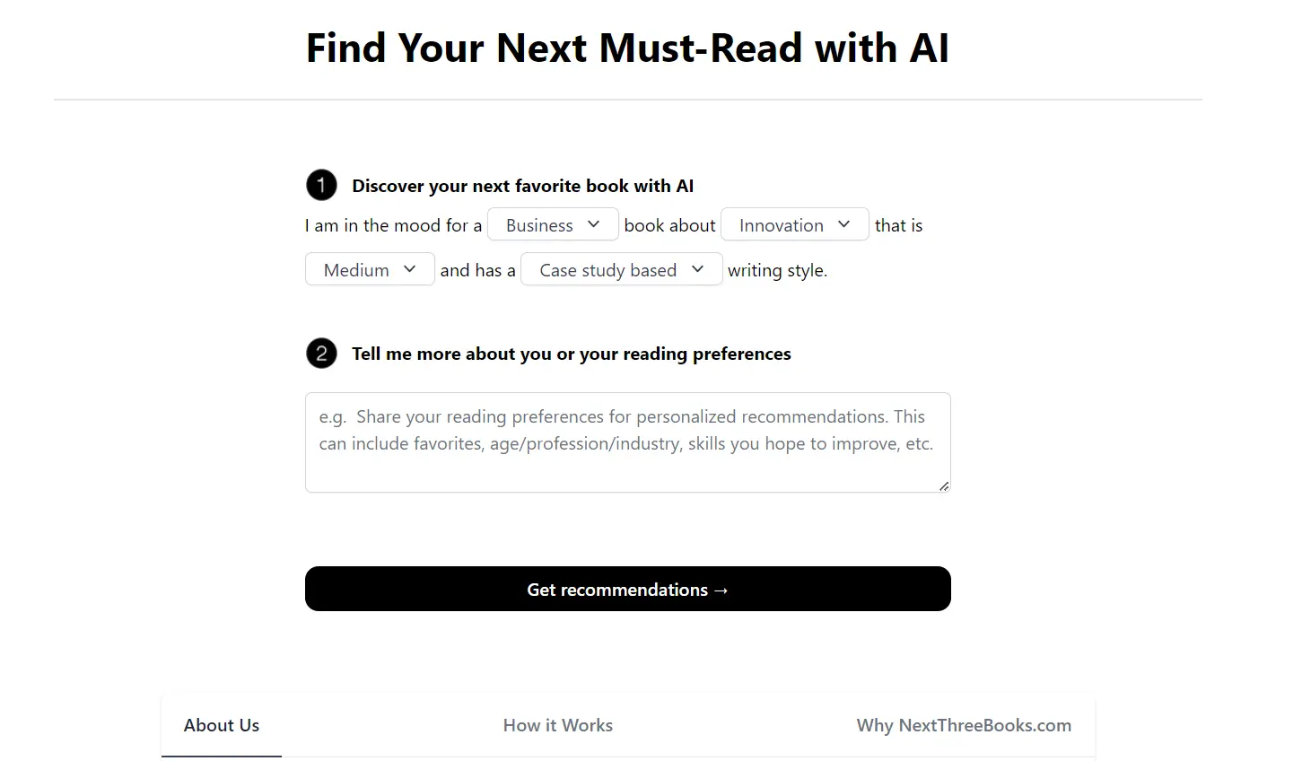 NextThreeBooks is an AI tool that can help you find your next three books to read. It uses natural language processing and machine learning to analyze your reading history and suggest books that you may like. It takes into account the genres and topics that you have already read, as well as the authors and publishers that you have previously enjoyed. It also takes into account the ratings and reviews that other readers have given to the books, so you can be sure that the books you are recommended are of a high quality. The AI tool also looks at what other readers are currently reading, so you can stay up to date with the latest trends. With NextThreeBooks, you can easily find your next three books to read without having to search through hundreds of titles.