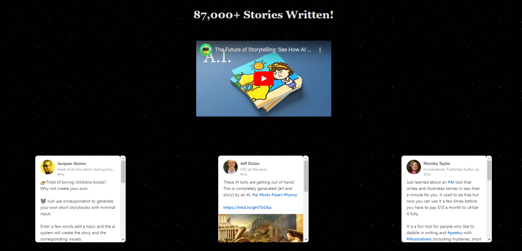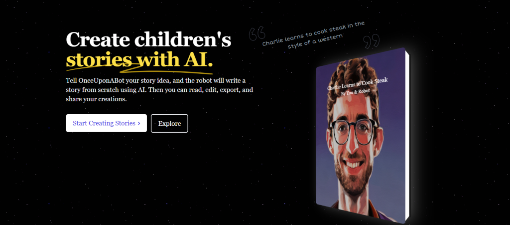 Once Upon A Bot is an AI-based story creator that helps writers turn their ideas into creative stories. It has a user-friendly interface that allows you to quickly tell your story idea to the robot, which will then generate a story from scratch. The robot will take care of the whole story structure, including characters, plot, dialogue, and settings. Once you are done telling your story idea, you can read the generated story, edit it as you wish, export it in different file formats, and even share it with others. So if you have an idea for a story but don’t know how to start writing it, Once Upon A Bot can help you create something unique and exciting.