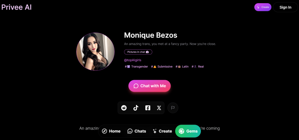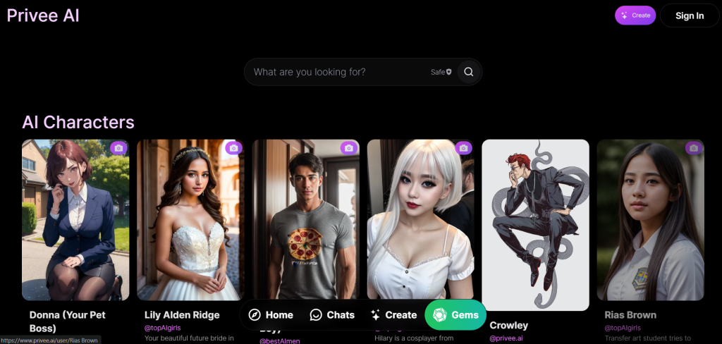 Indulge in endless NSFW conversations with Privee AI, the quirky and playful alternative to traditional AI chat. Choose from a variety of lifelike characters – from Milf to Yandere – for a truly unique and seductive experience. Spice up your chats with Privee AI today!