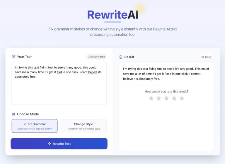 Rewrite AI fixes grammar and changes writing style with one click. It’s totally free.