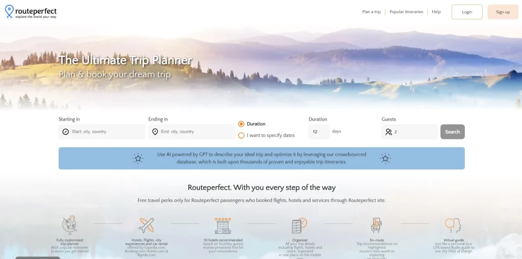 Routeperfect is an innovative and powerful AI tool that revolutionizes the way travelers plan their trips. With its intelligent algorithms and vast database of destinations, attractions, and accommodations, Routeperfect enables users to create personalized itineraries that are both efficient and enjoyable. This cutting-edge technology takes into account various factors such as travel preferences, budget limitations, and time constraints to curate the perfect route, ensuring a seamless and unforgettable travel experience. The user-friendly interface and intuitive features make navigating through the platform effortless, allowing travelers to explore different options and make informed decisions. Routeperfect’s meticulous attention to detail and comprehensive suggestions ensure that every aspect of the journey is carefully considered, from transportation arrangements to recommended activities and local gems.