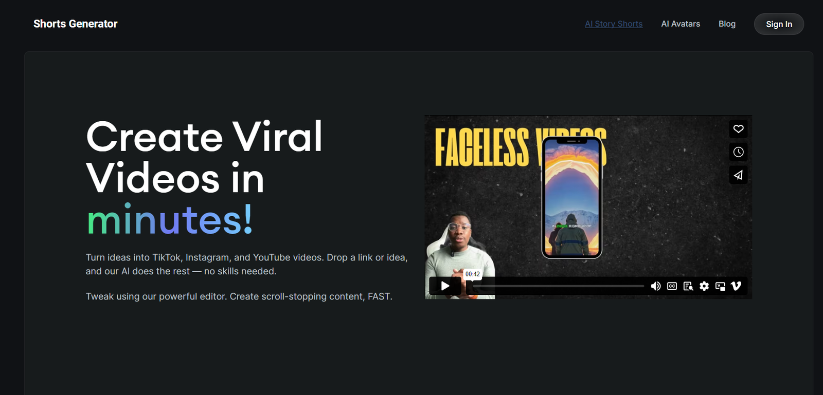 Experience how ShortsGenerator.ai transforms ideas into stunning, high-quality videos in seconds. Discover the creativity, efficiency, and uniqueness it brings to your content.