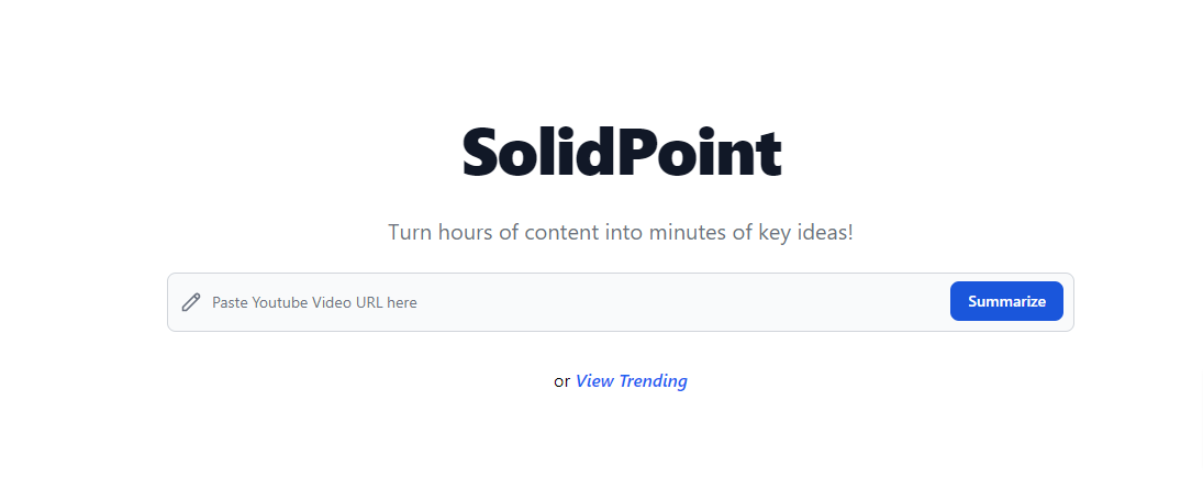 SolidPoint is an AI-based tool that helps you get summaries of Youtube videos quickly and easily. All you have to do is paste a Youtube Video URL and SolidPoint will generate a summary of the video in no time. You can also view summaries of trending videos on the website, so you never miss out on any important information. With SolidPoint, summarizing long videos has never been easier!