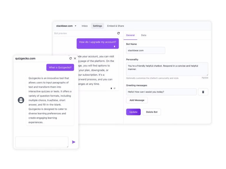 Automate your customer support with AI. Build a custom, ChatGPT style chatbot for your website in minutes. Simply add your website, then Stackbear will scan your content and train a knowledgeable bot. Add to your site in seconds simply by copy and pasting, reduce your support load by over 50%.