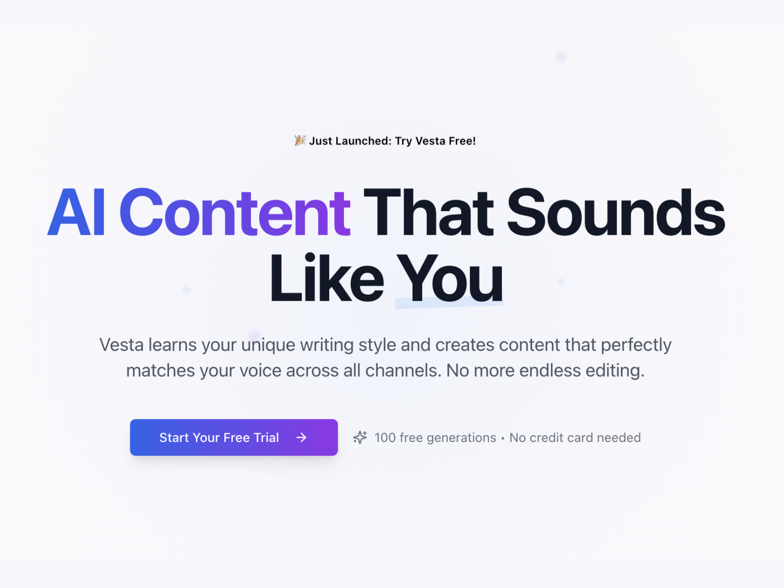 Vesta generates content in your style across any of your marketing channels. No more editing, and in some cases rewriting, ChatGPT’s generic content.