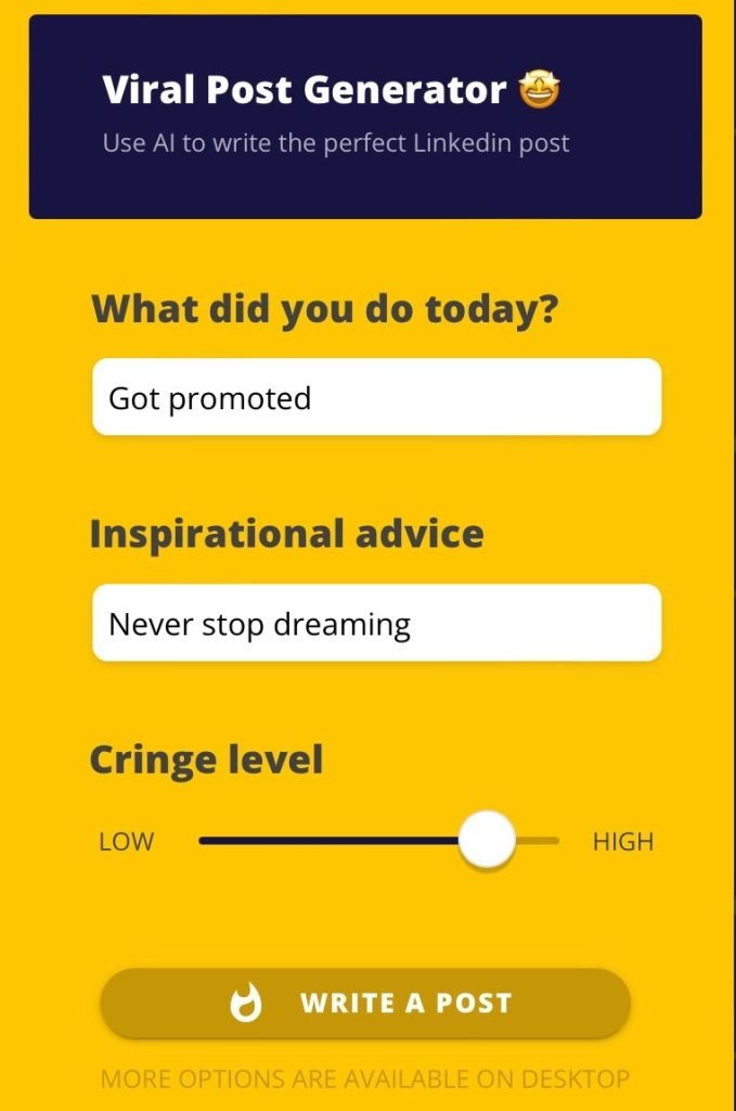 The Viral Post Generator ai tool is a revolutionary new tool that has the potential to revolutionize the way we create content. With this tool, you can create engaging and viral posts in no time. The tool is powered by artificial intelligence and uses natural language processing to generate relevant and engaging content. It can generate content in any tone of voice, from casual to professional, and it can even create content in multiple languages. With this tool, you can create content quickly and efficiently, and you can rest assured that your content will be engaging and shareable. The Viral Post Generator ai tool is a must-have for anyone who wants to create content that will be seen and shared.