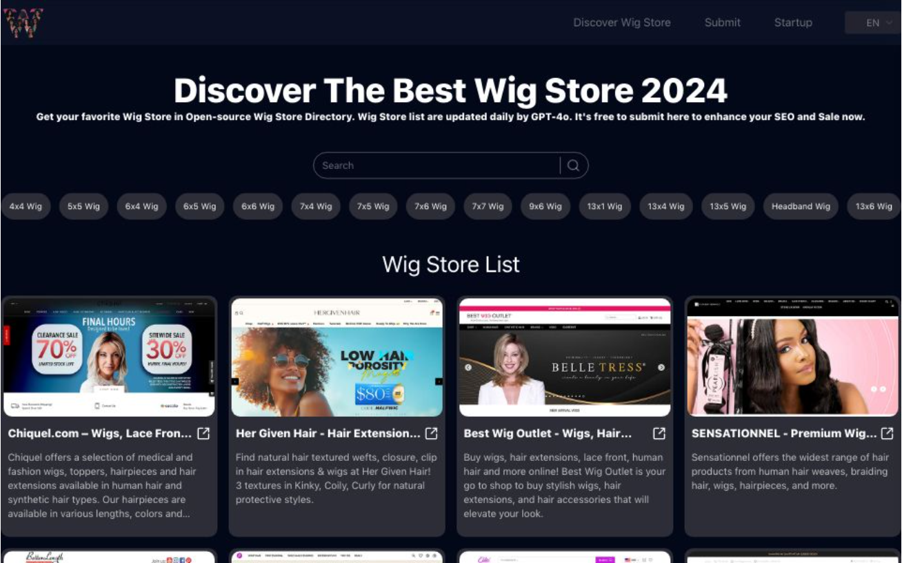 Wig Store Directory helps you get your favorite wig stores, It is driven by AI data, can get all kinds of wig stores, lace front wig 13×6 wig, 13×4 wig, 13×9 wig, 360 wig, full lace wig, lace closure wig: 4×4 wig, 6×6 wig, 2×6 wig, 6×9 wig, bob wig store, wear and go wig store.