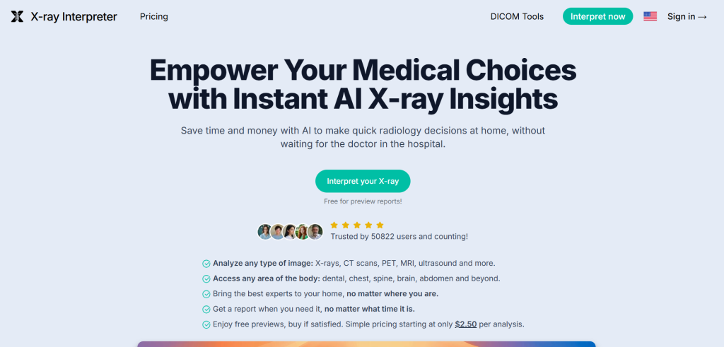 An AI tool for interpreting various types of radiographs. Get a quick initial assessment and better understanding before medical consultation