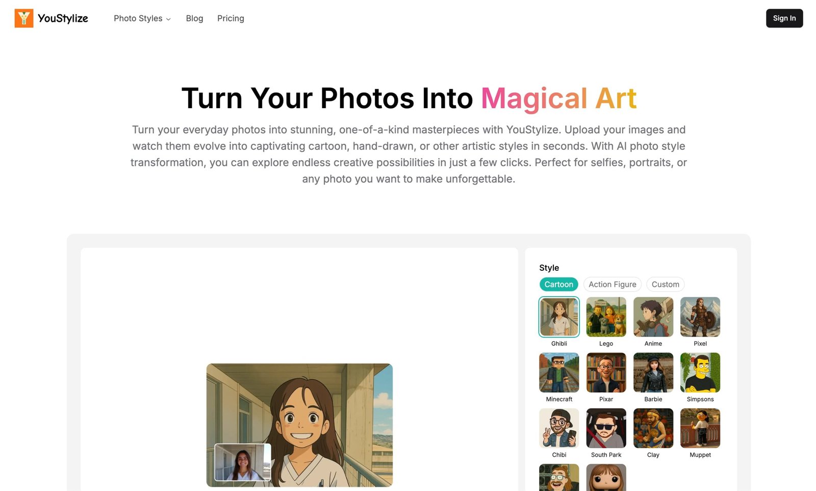 YouStylize is an online tool that lets you transform your photos into amazing new styles with the power of AI. Whether you want to see yourself as a cartoon, an action figure, a sketch, or a work of art, YouStylize makes it easy and fun.